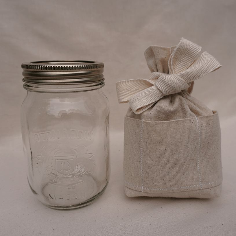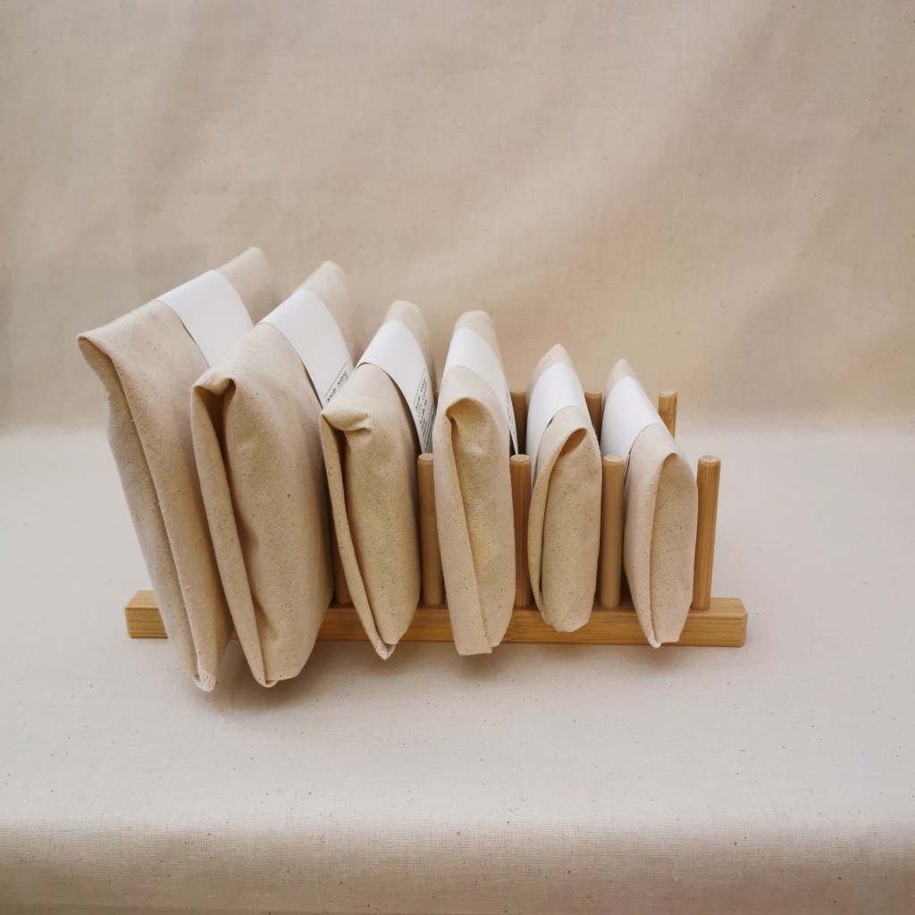Chaque sac est emballé dans un carré de coton qui pourra par la suite être utilisé comme emballage secondaire (papier de soie).